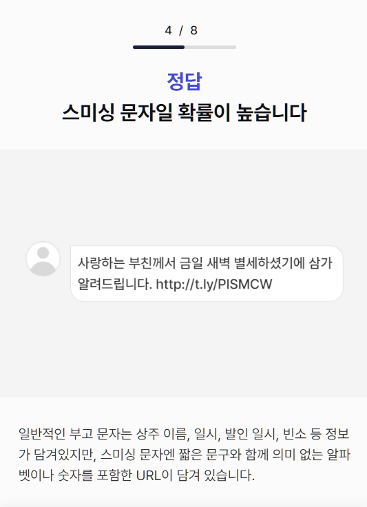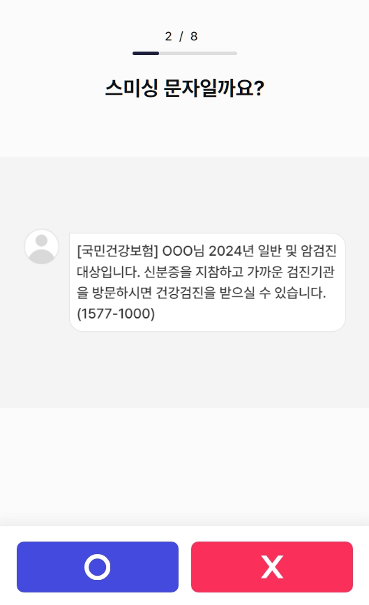 보이스피싱에 대한 경각심이 높아지는 가운데 우리나라 유력 일간지인 동아일보 DX본부에서 2023년에 많이 발생한 스미싱 사례를 활용해 인터랙티브 퀴즈 ‘보이스피싱 탐지력 테스트’를 제작하였습니다. 퀴즈에 등장하는 문자 메시지가 실제로 스미싱 범죄 문자인지 아닌지 간단한 OX 퀴즈로 풀어보고, 정답과 해설을 확인할 수 있습니다.