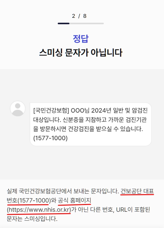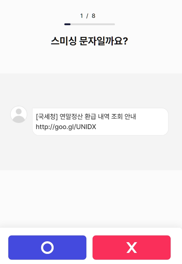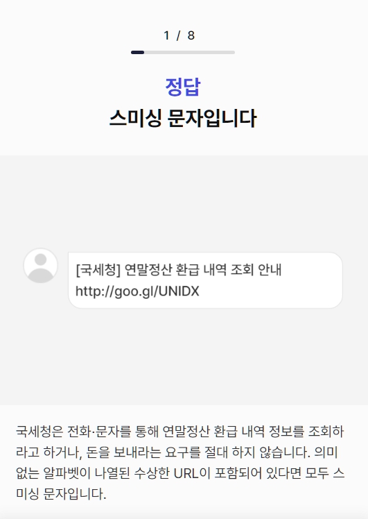 총 8개 문항에 대해 OX 퀴즈를 풀어봅니다. 답을 맞히지 못하였다면 해설을 참조하여 어느 부분에서 풀지 못하였는지를 확인하면 됩니다. 해설이 잘 되어 있어 범죄 예방 및 대처 능력 향상 자료로 손색이 없습니다. 하나씩 문제를 풀어갑니다. 첫 문제는 국세청 연말정산 환급금 관련 문자로 시작합니다.